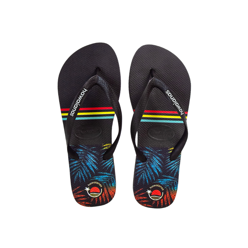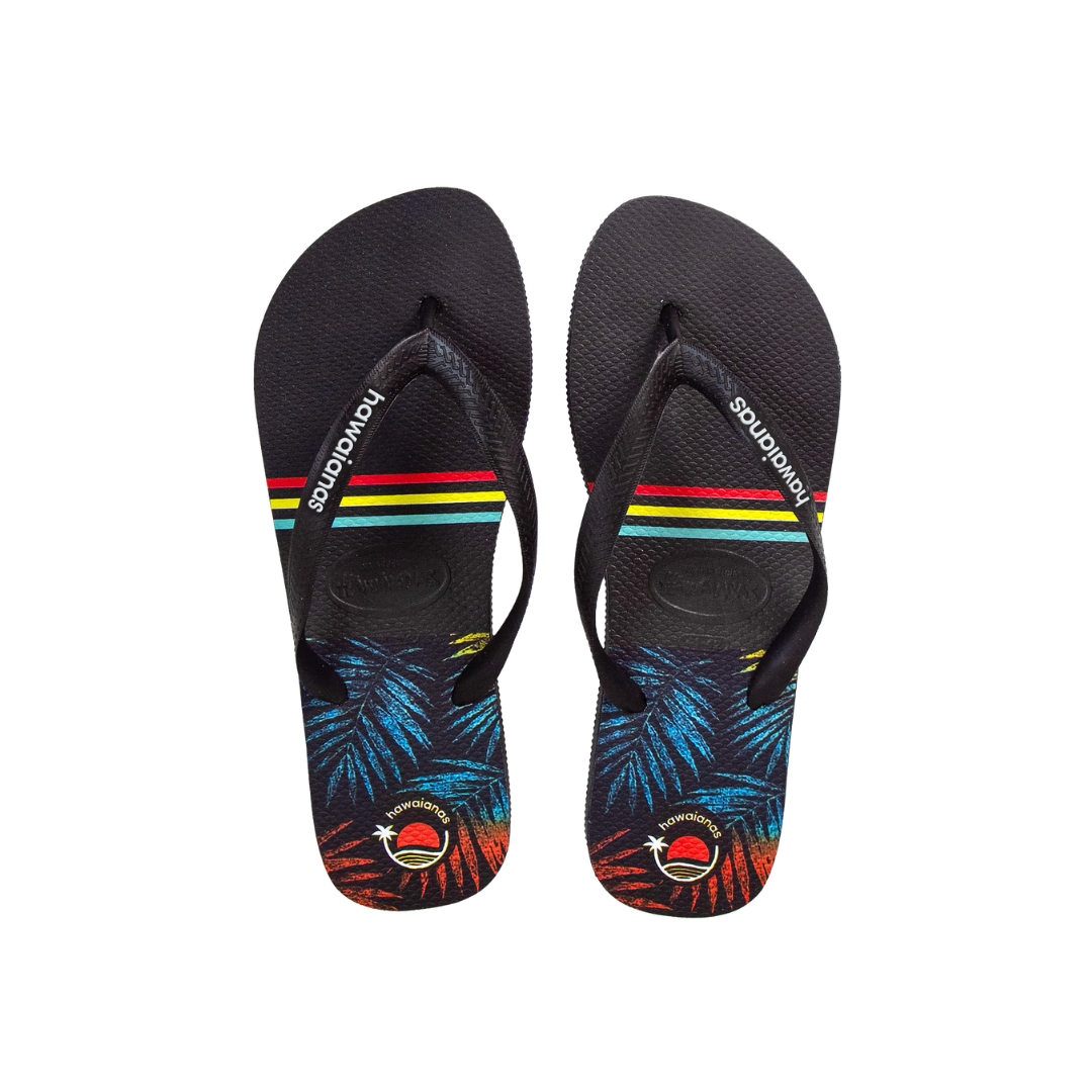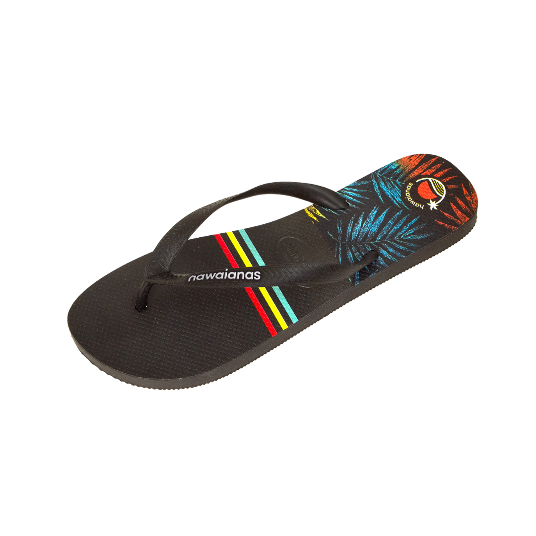 Las Ojotas Hawaianas Trial ofrecen un diseño moderno y lleno de estilo. Con base y tiras en color negro, presentan una estampa con tres líneas en tonos rojo, amarillo y verde en la parte media, junto a un detalle de hojas tropicales en azul y celeste en la parte inferior. Resistentes, cómodas y versátiles, son el calzado ideal para el verano, ya sea en la playa, la pileta o la ciudad.