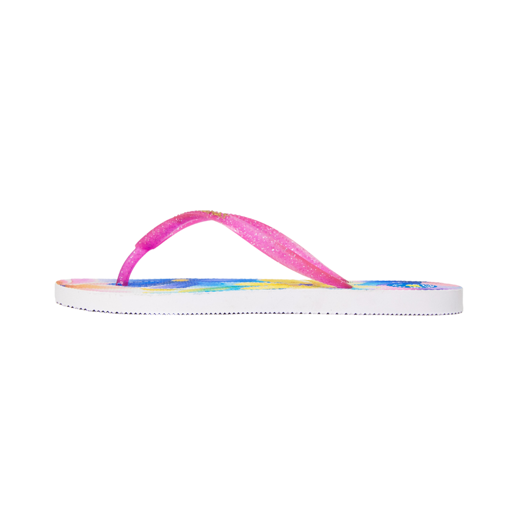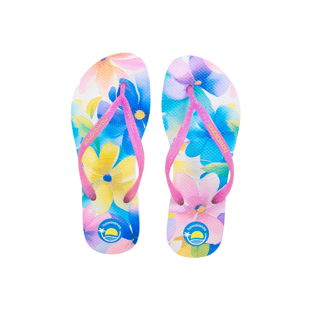 Ojota Slim Acuarela Dama – Hawaianas Las ojotas Hawaianas Slim Acuarela para dama destacan por su diseño delicado y femenino. Con base blanca y estampa de flores en tonos rosa, azul, verde y amarillo estilo acuarela, transmiten frescura y alegría. Sus tiras finas en color rosa complementan el look, mientras que su suela liviana y resistente asegura comodidad en cada paso.