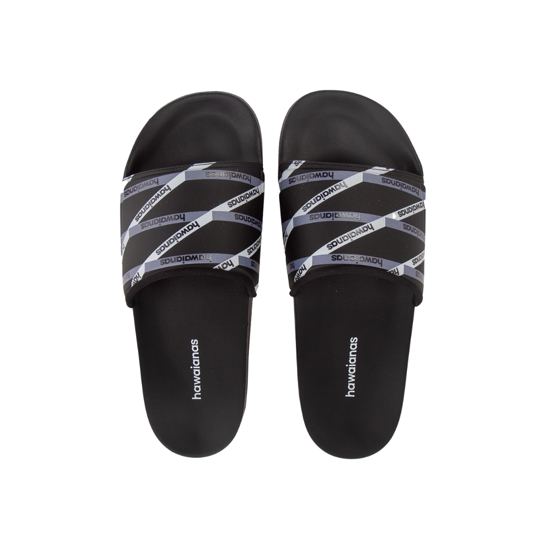 Estilo Moderno: Base negra con faja al tono y logo Hawaianas repetido.