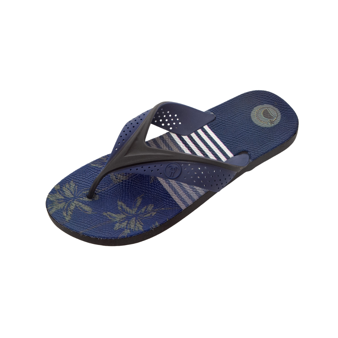 Base azul con estampa de hojas y rayas en tonos blanco, gris y violeta. Tiras anchas en azul oscuro que aseguran un calce firme y cómodo.