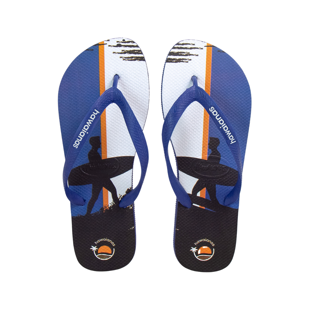 Las Ojotas Hawaianas Break board para hombre están diseñadas para quienes disfrutan del mar, la playa y la comodidad en cada paso. Su base azul y blanca con línea naranja central y la silueta de un surfista con tabla reflejan el estilo libre y aventurero del surf.