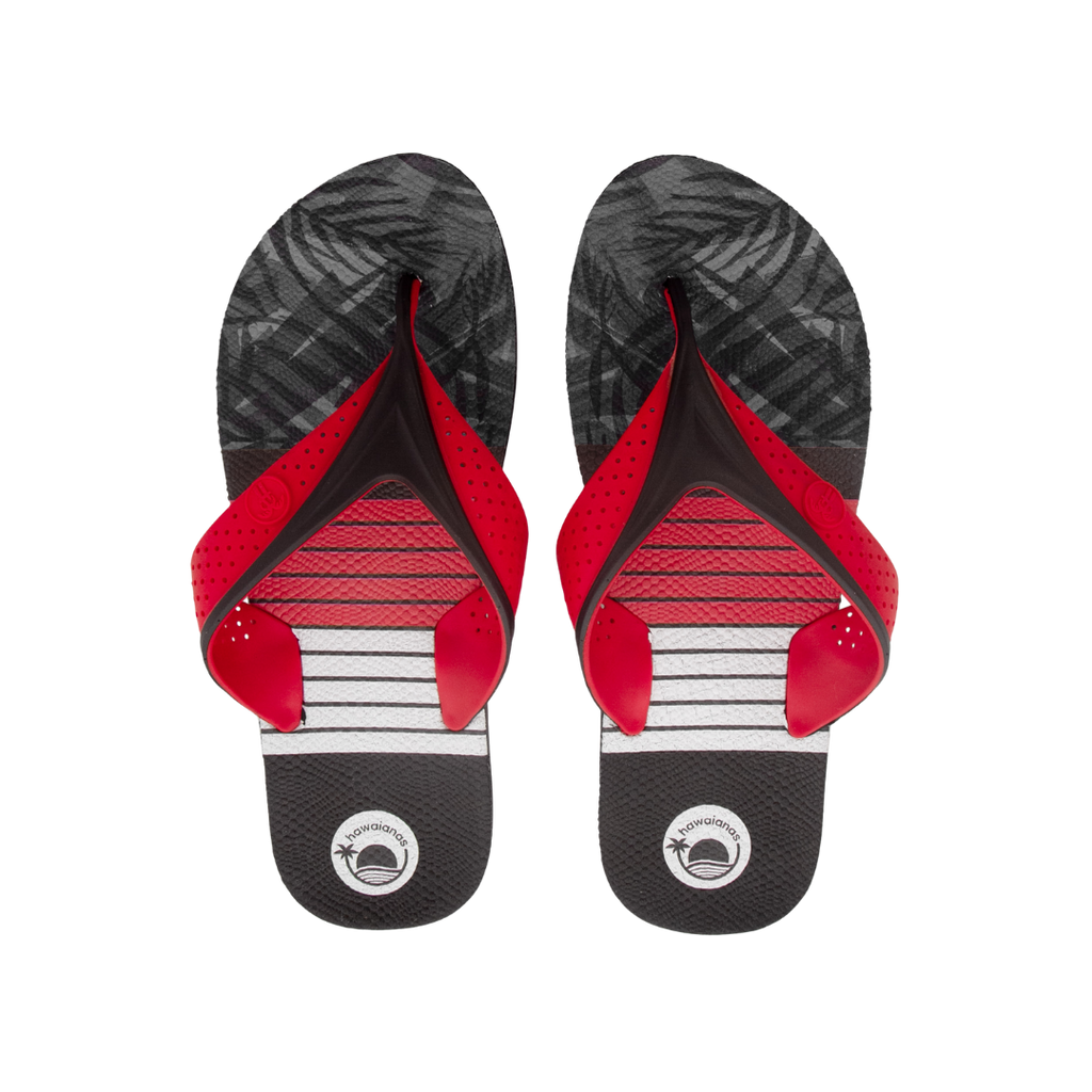 Las Ojotas Hawaianas Surf Rush Teen combinan energía, estilo y comodidad en un diseño pensado para jóvenes con espíritu aventurero. Su base negra se realza con tiras rojas resistentes, mientras que la estampa mezcla hojas tropicales con un patrón rayado en blanco y rojo, creando un look dinámico y moderno.